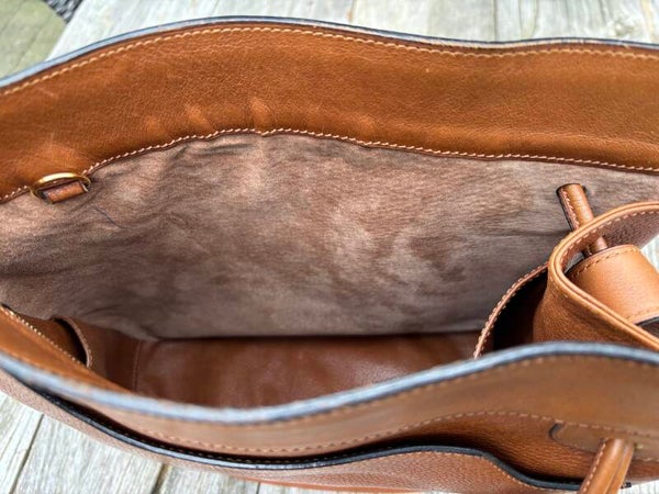 Deze tas werd zorgvuldig gerestaureerd in het atelier en weer in ere hersteld, klaar voor een nieuw leven.